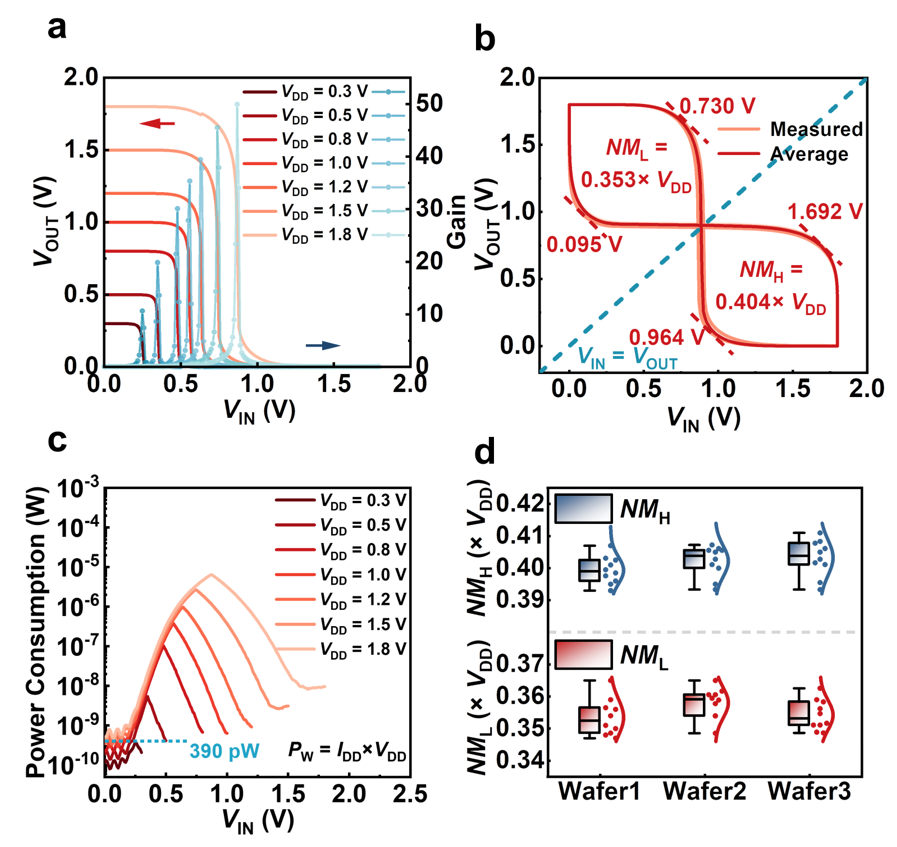 针对这些挑战,中国科学院微电子研究所抗辐照实验室的李博研究员和陆芃副研究员团队,利用碳纳米管材料的低温成膜特性,提出了一种碳纳米管/硅异质集成(CNT/Si Heterogeneous Integration)的3D CMOS技术。这一技术在180nm SOI器件的后道工艺中实现了低温(≤150℃)碳纳米管器件的集成。团队提出了针对高性能数字电路应用的工艺优化方案,通过精确调控碳纳米管器件的阈值电压,实现了N、P晶体管电学特性的匹配,显著提升了3D CMOS的噪声容限(NMH/NML = 0.404/0.353× VDD),并达到了高增益(~49.9)、超低功耗(390 pW)及高均一性(片间差异较小)的效果。