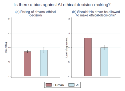 研究人员观察到,当受试者被要求评估人类或人工智能驾驶员的道德决定时,他们对两者都没有明确的偏好。然而,当受试者被问及是否应该允许人工智能在道路上做出道德决定的明确意见时,受试者对人工智能驾驶的汽车有更强烈的意见。
