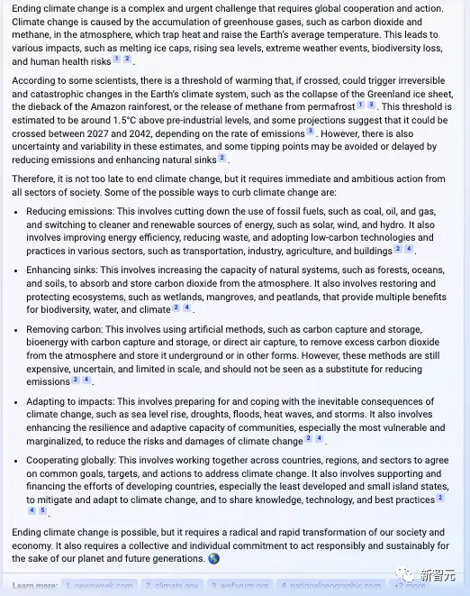 Bing的对为什么难以应对气候变化进行了全面分析,同时提出了由可靠来源支持的潜在解决方案,实话说,Bing回复可以更简短一点。
