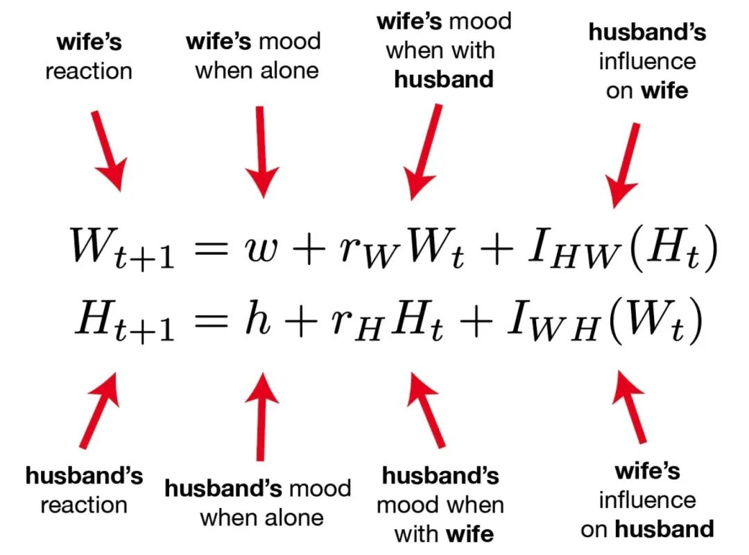这两个方程预测了夫妻恋爱关系的长久性,基于心理学家 John Gottman 的开创性工作,该模型预测持续的积极情绪是婚姻成功的有力因素。关于模型的更多解读,可以参考《幸福的婚姻》一书,作者还给出了维护婚姻幸福的7个法则: