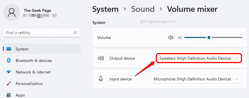 第 2 步:现在在音量混合器窗口中,您可以从与输出设备选项关联的下拉列表中选择您喜欢的输出设备。