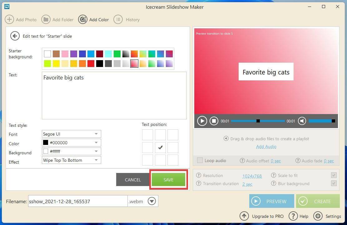 - 在这个新窗口中,您可以更改背景的颜色、标题、文本字体,甚至过渡效果。
