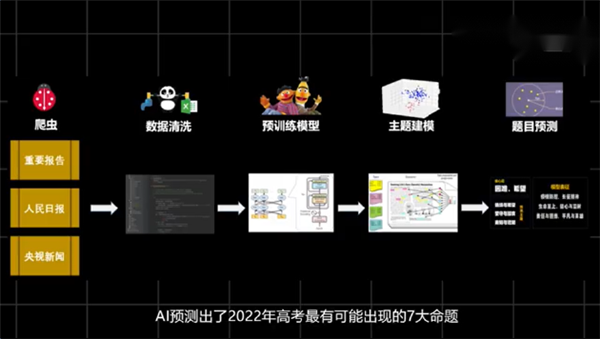 然后再通过自然语言处理中的预训练模型和主题建模算法,建立了一套可以理解中文新闻与文章的AI系统,并让AI系统学习了过去几年的高考作文出题思路,最终预测出了2022年高考中最可能出现的7个命题方向。