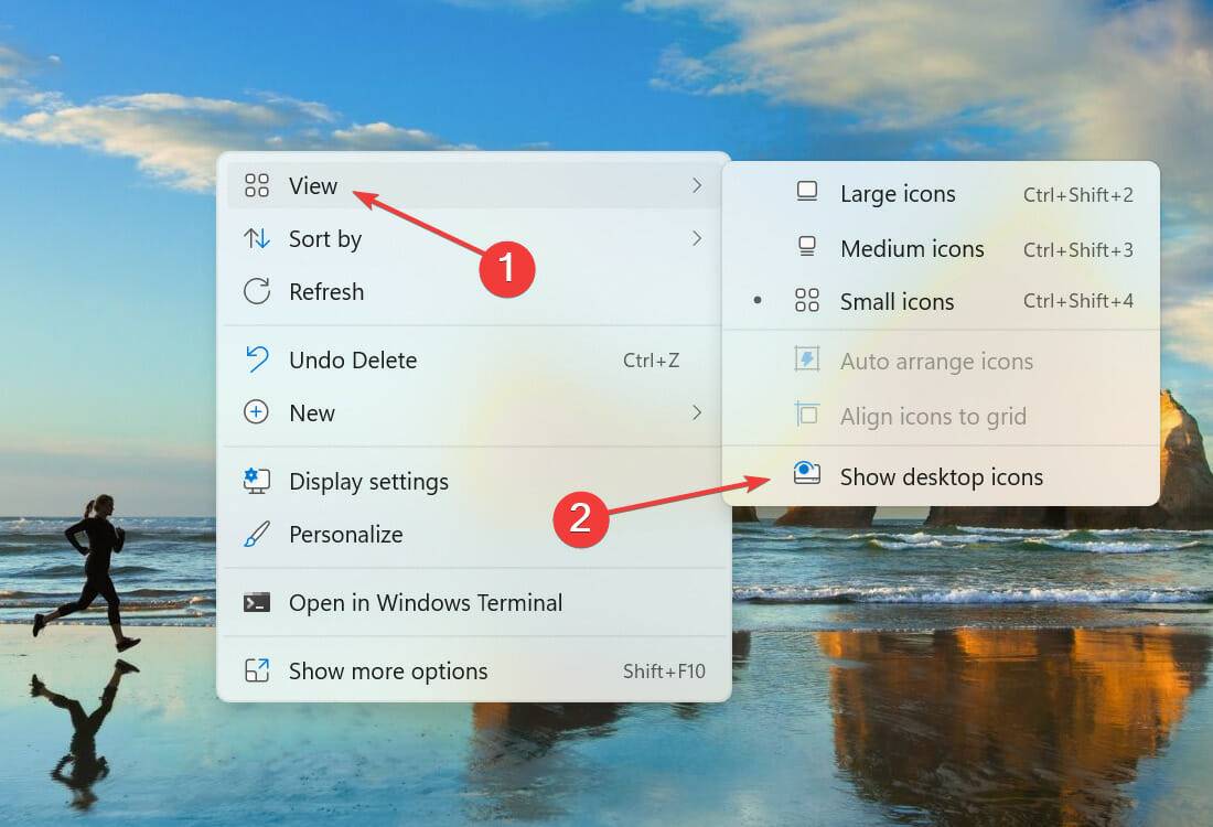 - 现在,右键单击桌面,将光标悬停在View上,然后从弹出菜单中取消选中Show desktop icons选项。
