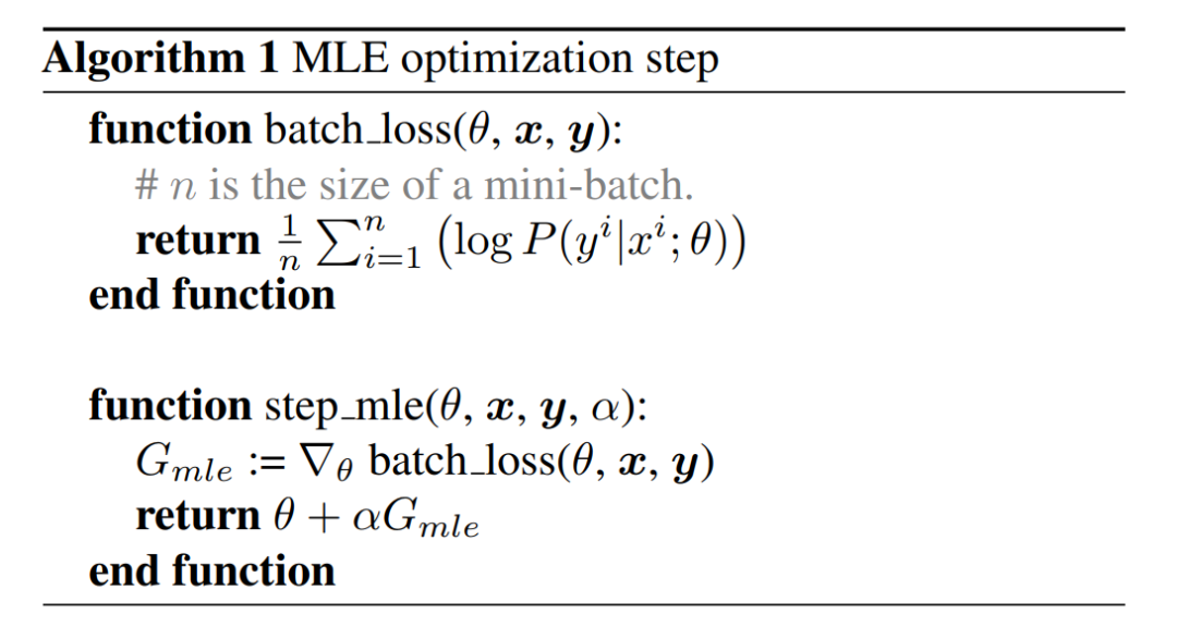 来实现。算法 1 和图 2 描述了 MLE(最大似然估计)优化步骤,这是训练模型最常用的方法。完成这一步将得到 MLE 模型。