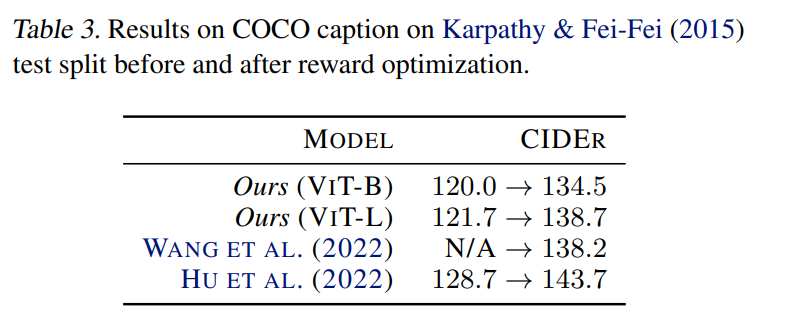 此外,同样的方法被广泛用于图像字幕任务中,其中 CIDEr(Vedantam 等人 2015 年提出)被用来作为奖励。尽管如此,据了解,奖励优化以前还没有在(非文本)计算机视觉任务中进行过探索。