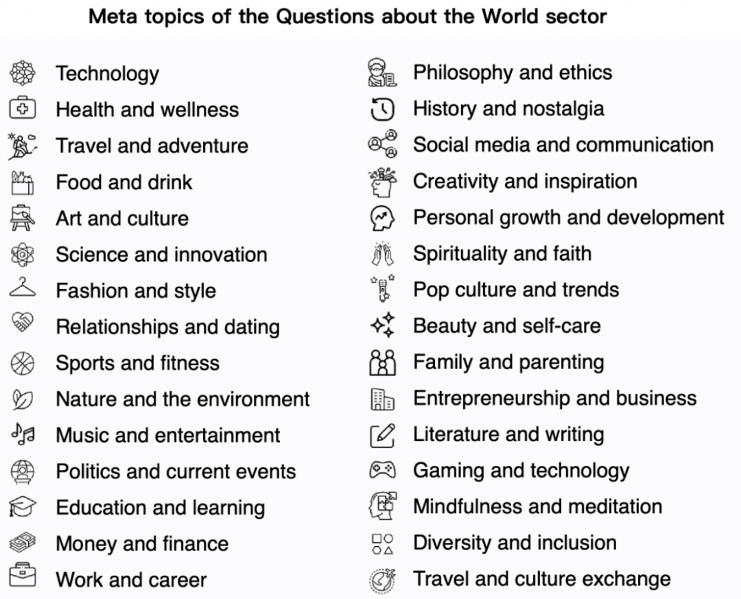 世界问题数据来源于 30 个具有代表性和多样性的元主题,如下图所示: