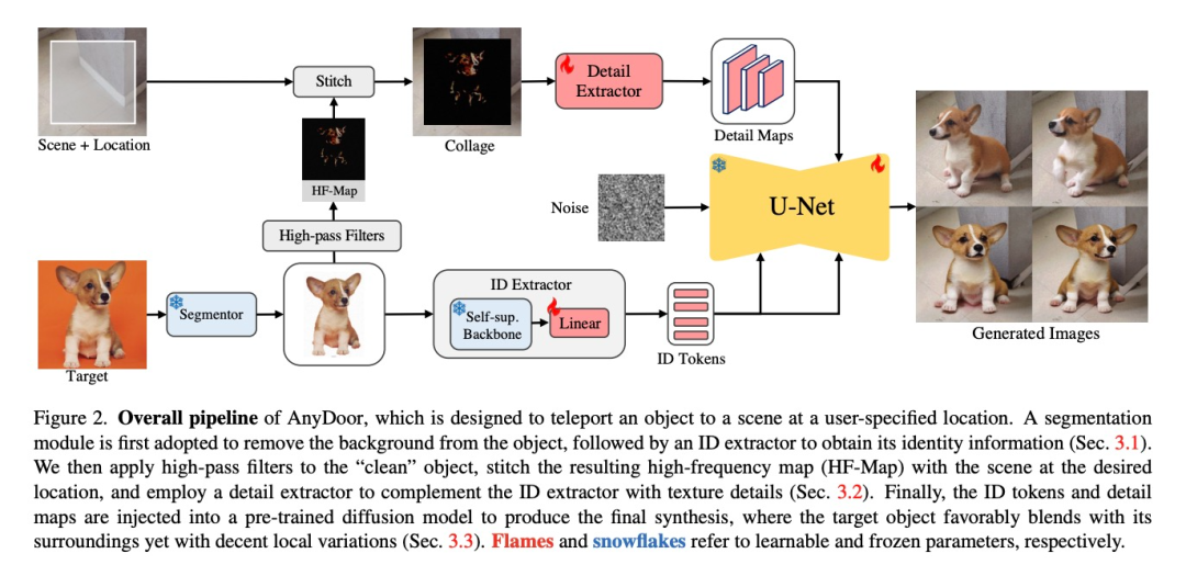 对于给定目标对象、场景和位置,Anydoor 实现了高保真度和多样化的零样本对象 - 场景合成。为了做到这一点,作者的核心思想是用身份和细节高度相关的特征来表示目标对象,然后将它们组合到与背景场景的交互之中。作者用一个 ID 提取器来生产有区分度的 ID token,并设计了一个以频率感知的细节提取器来获取细节图作为补充。再将 ID token 和提取器获得的细节图注入一个预训练好的文本到图像扩散模型中,指导生成所需的图像。