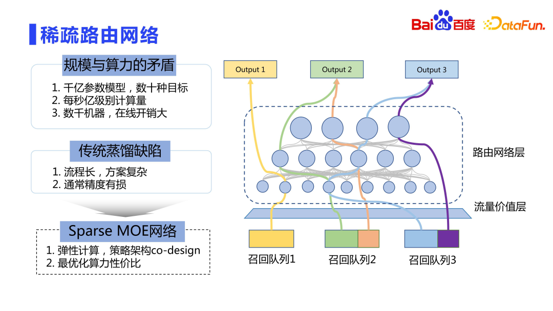 粗排接入了非常多的队列,有数十个甚至数百个队列。这些队列对线上的价值(LTV)是不一样的,由流量价值层来计算不同召回队列对线上点击时长的价值。其核心思想是召回队列整体的贡献度越大,越可以享受更复杂的计算。从而使得有限的算力能够服务于更高价值的流量。所以我们也没有采用传统的蒸馏的方式,而是采用类似 Sparse MOE 的思想来做弹性计算,即策略跟架构 co-design 的设计,使得不同的召回队列能够使用最适合的资源网络进行计算。