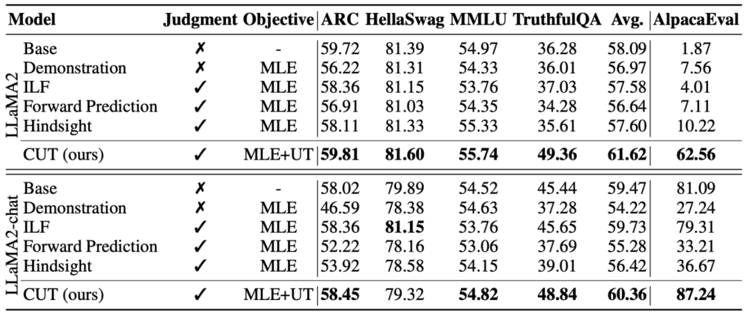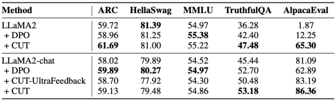在基于 LLaMA2 的冷启动实验下,CUT 在 AlpacaEval 测试平台上大幅超越现有对齐方法,充分证明了其在利用语言反馈方面的优势。并且 CUT 在 TruthfulQA 上相比于基座模型也取得了大幅提升,这揭示了 CUT 在缓解大模型幻觉(hallucination)问题上有巨大潜力。