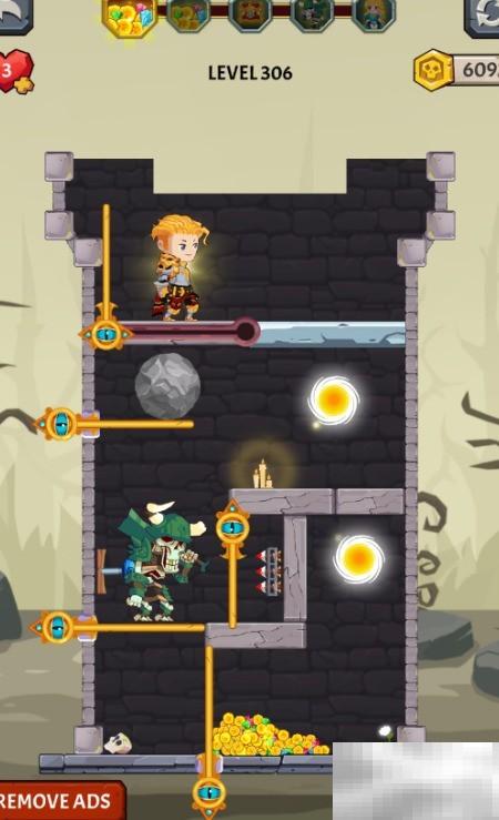 《守护荣耀》第306关通关攻略:巧用机关、精准操作是核心,留意敌方行进路径与防御设施的协同配合。1、少年初始位置在左上方高地,上方骷髅兵被巨石压制,本关目标为夺取底部宝箱,详细站位与机关分布请参考下图。2、点击移除骷髅兵右侧的垂直拉针,触发机关连锁反应,操作示意如下图所示。3、向右滑动少年左侧的水平推拉杆,完成关键机关联动,具体手势方向见图示。4、少年顺利抵达宝箱位置并拾取,屏幕随即显示“VICTORY!”胜利提示,本关挑战圆满完成。