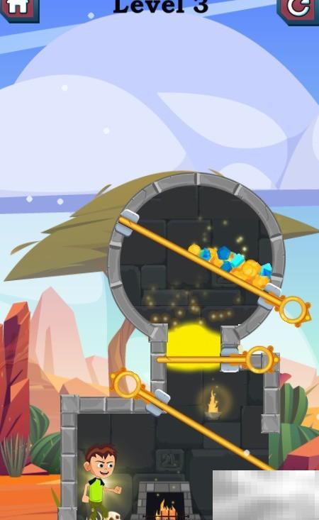 HealTheWorld第三关通关技巧分享:1、本关宝物悬于高处,需引导熔岩流向外部区域,详细操作步骤请参考下图。2、点击并移除熔岩正下方的短型插销,操作示意如下图所示。3、长按后拖动移除底部倾斜设置的插销,具体位置见下图。4、依照图示指示,点击清除其余倾斜方向的插销。5、宝藏成功获取后,界面将自动播放YOUWON庆祝动画,如图所示,即代表本关挑战圆满完成。