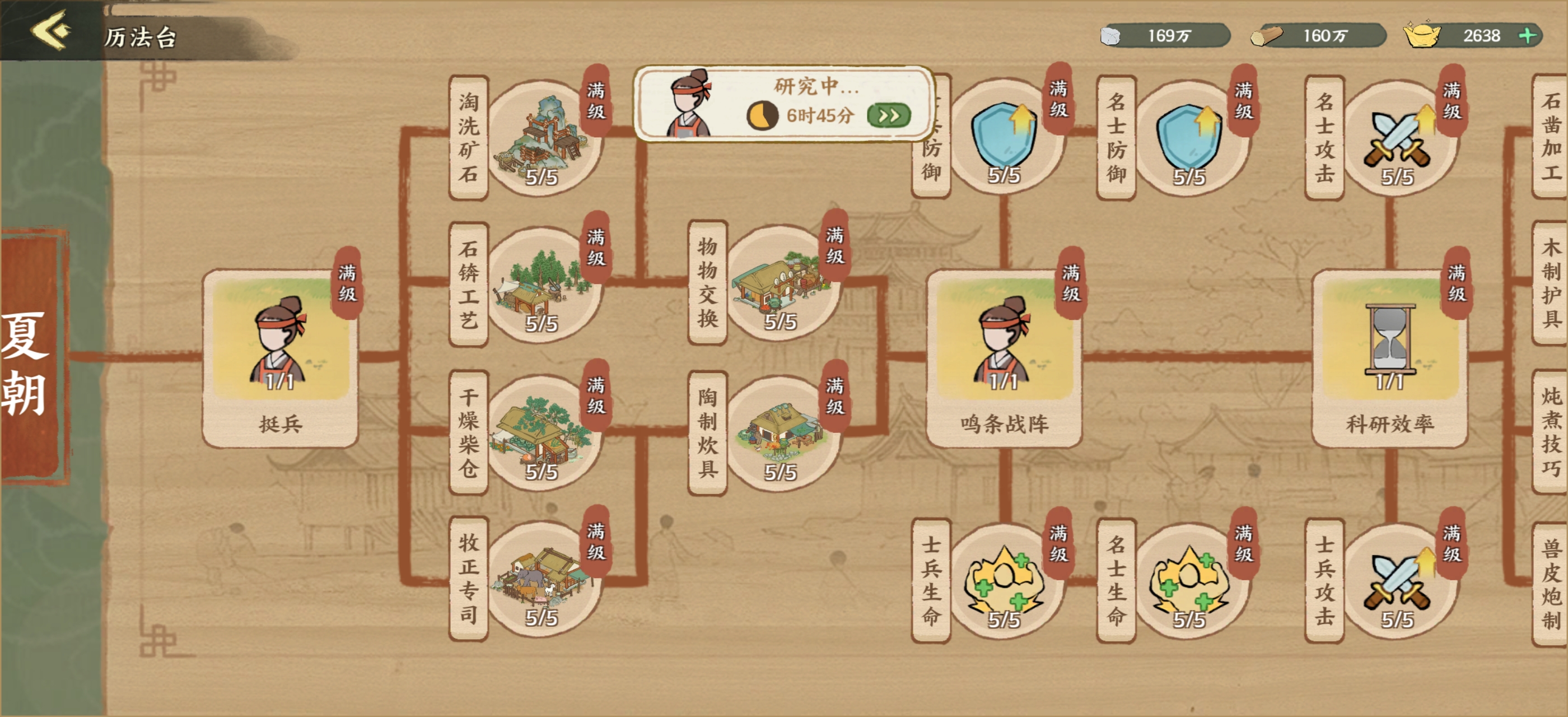 华夏绘世录历法台进阶指南历法台在14级时开启(通常第二天即可解锁),前期操作较为繁琐,仅有一个升级队列,需频繁登录以推进进度。夏朝阶段的科技升级耗时较短,若投入较多时间,基本可全部点满。但若每日上线次数有限,建议按以下顺序优先升级:兵+1→木或铁升至3级→铜币升至5级→兵+1→科研效率→木/铁再升3级→铜币再升5级→兵+1→兵力与名士属性加成(木料与铁矿根据自身资源情况择一优先升级即可)经过五天的游戏进程,除铜币外,其余资源通常较为充裕(主要瓶颈在于建筑升级所需时间),因此
