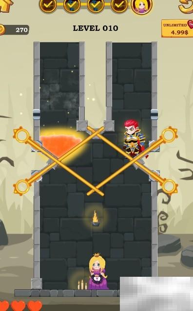 《TheStruggleTime》第010关通关指南:巧用策略、精准操作是制胜核心。1、本关目标为营救被困于场景底部的公主,勇士初始位置在右上方区域,机关中共设有五根可移除拉针,具体分布请参考下方示意图。2、首先点击移除位于勇士正下方的横向拉针,操作示意如下:3、接着点击移除勇士右下侧的斜向拉针,位置与操作方式见图:4、随后点击移除勇士下方另一根斜向拉针,细节布局如下图所示:5、完成上述三步后,勇士将自动跃落至地面,与公主汇合;此时通关成功,系统弹出胜利界面,如图所示,顺利解锁下一关卡。