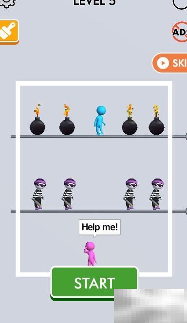 BlueMeetPink第五关通关技巧(简化版):1、蓝色小人被困在地雷区域内部,而四名敌方单位则分布在粉色小人正上方,布局可参考下图。2、优先点击蓝色角色正下方的横向插销,触发机关开启,操作示意如下图所示。3、接着依照图中提示,依次激活其余所有横向插销。4、当蓝、粉两角色顺利汇合后,界面将弹出通关提示,本关即告完成。