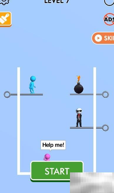 BlueMeetPink第7关通关技巧分享:1、本关共设置三根水平方向的插销,敌人位于蓝色角色右下方,整体结构可参考下图。2、首先点击并移除地雷正下方那根横向插销,操作方式如下图所示。3、接着点击蓝色角色正下方的那根横放插销,具体位置见图示。4、完成上述两步后,蓝色角色与粉色角色即可顺利相遇,界面弹出通关提示,标志本关成功通过。