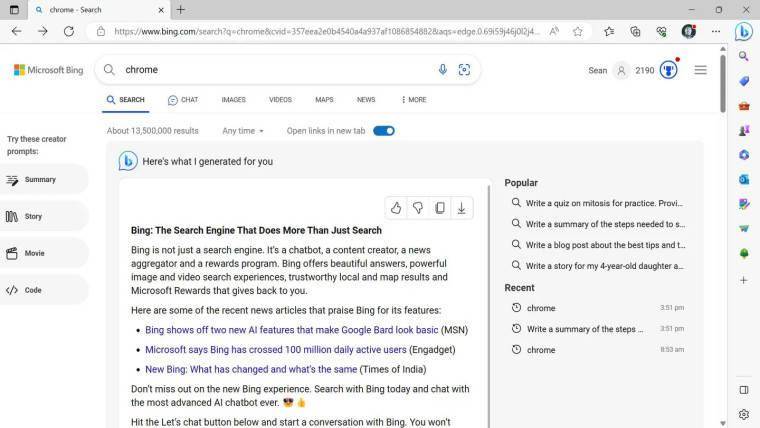 IT之家6月7日消息,当用户在今年2月使用Edge下载谷歌Chrome浏览器时,微软为Edge浏览器推出了全尺寸广告。现在,微软似乎又故技重施,但使用了新的方法。据TheVerge报道,在美国不同地区甚至美国以外的记者在Edge浏览器中输入“Chrome”时,它反而生成了看起来像BingChatAI的答案,但是内容和Chrome无关,而是一则关于必应搜索的广告,标题是“Bing:不仅仅是搜索的搜索引擎”。显然,微软决定在用户使用Edge查找有关“Chrome”信息时,通过AI搜索答案为Bing投放了广告,