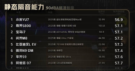 【小编】懂车帝最新发布的车型隔音性能评测数据显示,小米汽车首款量产车YU7在静态隔音测试中拔得头筹,以56.9dBA的优异成绩位居榜首,力压尊界S800(57.1dBA)与宝马i7(57.1dBA)等百万级豪华旗舰车型。本次测试采用90dBA标准粉红噪声作为声源,参测车型为小米YU72025款超长续航四驱Max版,官方售价32.99万元。实测显示,其车内静音水平较尊界S800低0.2dBA,相较宝马i7亦低0.2dBA。而这两款竞品车型指导价分别为101.8万元和94.9万元,约为小米YU7售价的三倍,