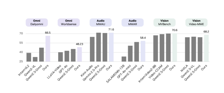 英伟达研究团队近日推出了一款名为OmniVinci的全模态理解模型,该模型在关键的全模态基准测试中表现卓越,领先当前最优模型高达19.05分。更令人瞩目的是,OmniVinci仅依赖其六分之一的训练数据量,便实现了这一突破性成果,充分展现了其在数据利用效率和模型性能上的双重优势。OmniVinci致力于构建一个能同时处理视觉、音频与文本信息的通用人工智能系统,目标是让机器具备类似人类的多感官感知能力,从而更全面地理解和解析现实世界中的复杂场景。为达成此目标,研究团队设计了全新的架构方案与数据处理策