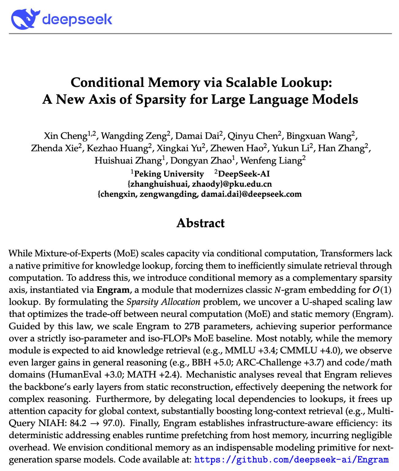 DeepSeek团队正式推出新研究论文《ConditionalMemoryviaScalableLookup:ANewAxisofSparsityforLargeLanguageModels》,创新性地引入“可扩展查找式记忆”机制,为大语言模型开辟了一条区别于标准Transformer架构与MoE范式的全新稀疏化路径。代码仓库:https://github.com/deepseek-ai/Engram论文原文:https://github.com/deepseek-a
