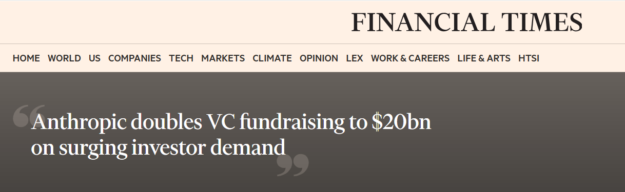据英国《金融时报》援引多位知情人士报道,因市场反响热烈、资本竞相涌入,开发Claude与ClaudeCode系列大模型的AI公司Anthropic已将其最新一轮融资目标额大幅提升——由原先设定的100亿美元(约合人民币696.52亿元)上调至200亿美元(约合人民币1393.04亿元)。消息称,本轮募资进展顺利,预计将在短期内正式落定;交易完成后,Anthropic估值将跃升至3500亿美元(约合人民币2.44万亿元),刷新全球AI初创企业估值纪录。参与本轮融资的机构预计将涵盖红杉资本(Sequoia