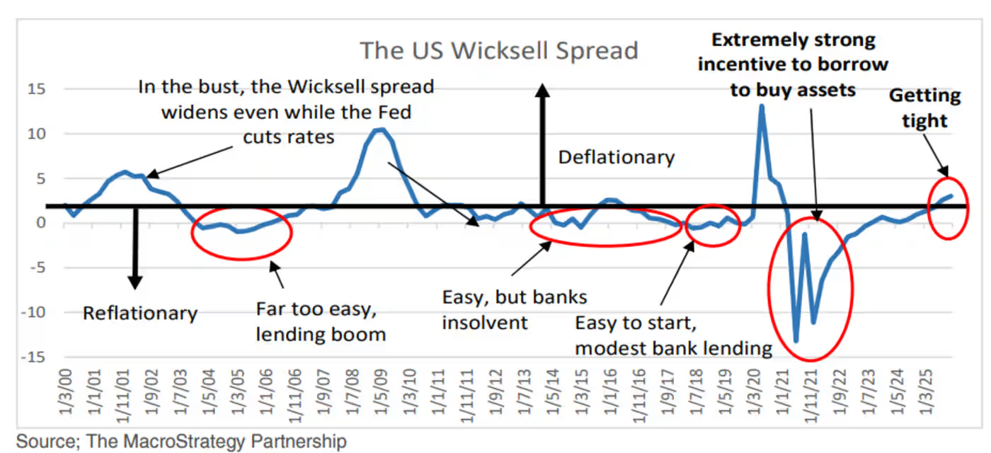 据MarketWatch消息,独立研究机构MacroStrategyPartnership在其最新发布的报告中发出警示:当前席卷全球的人工智能投资热潮正在催生“有史以来规模最大的科技泡沫”——这一泡沫的体量据估算已达上世纪末互联网泡沫的17倍,更是2008年次贷危机规模的4倍。该机构采用古典/威克塞尔(Wicksellian)资本理论作为分析基础:理想情况下,当借贷利率比名义GDP增长率高出约2个百分点时,资本配置才处于均衡状态。然而,长期宽松的货币政策导致利率远低于自然利率,引发大规模资本错配