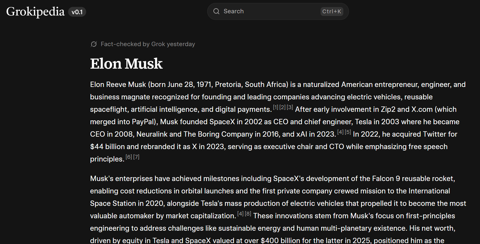 据美国《华盛顿邮报》和“商业内幕”网站消息,美国亿万富翁埃隆·马斯克于当地时间27日发布了由人工智能驱动的在线百科平台Grokipedia。此前他曾表示,这一新平台将作为比维基百科“偏见更少”的替代选择。报道指出,Grokipedia在当天低调上线,未进行任何公开宣传或官方声明。网站界面极为简朴,首页仅显示“Grokipediav0.1”字样以及一个用于输入搜索关键词的查询框。上线约一小时后,平台一度出现技术故障,但于当日晚间恢复正常访问。该平台在整体设计和布局上与维基百科类似,但内容体量远为有限。上线