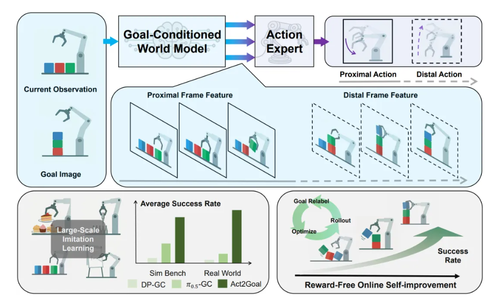 智元机器人正式推出Act2Goal技术方案——这不仅是一项前沿的操作算法升级,更代表了一种“目标驱动、以终为始”的全新智能体认知范式。据官方介绍,区别于传统机器人按部就班执行预设指令的被动模式,Act2Goal创新性地构建了“目标导向型世界模型”。该模型赋予机器人前所未有的前瞻性能力:在实际动作发生前,系统已在内部完成从当前状态到目标状态的全因果路径推演。这种将视觉理解与运动控制深度融合的端到端架构,使Act2Goal即便面对完全陌生的环境与未知物体,也能展现出卓越的零样本泛化性能。尤为关键的是