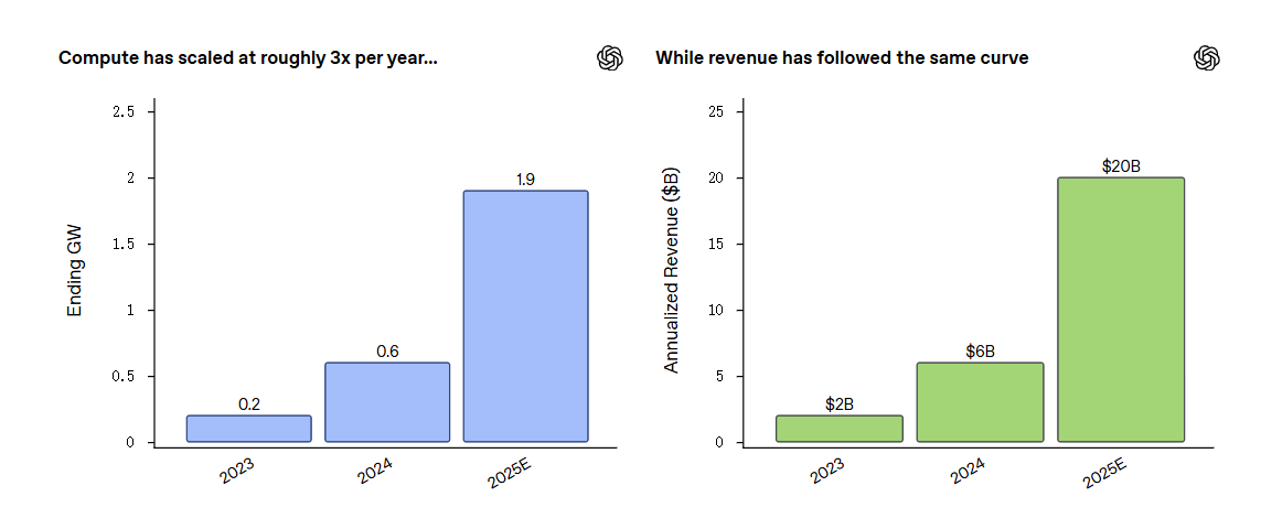 OpenAI首席财务官SarahFriar在一篇官方博客中公布了公司最新财务表现及数据中心扩建进展。文中强调,依托计算能力、尖端研究、产品迭代与商业化落地这四大核心环节形成的正向飞轮效应,其周活跃用户(WAU)与日活跃用户(DAU)指标接连刷新历史纪录。回溯过去三年,我们服务客户的能力(以营收为衡量标准)与可调用的算力规模高度同步:算力总量同比增长三倍,2023至2025年间增长达9.5倍——2023年为0.2GW,2024年升至0.6GW,预计2025年将达约1.9