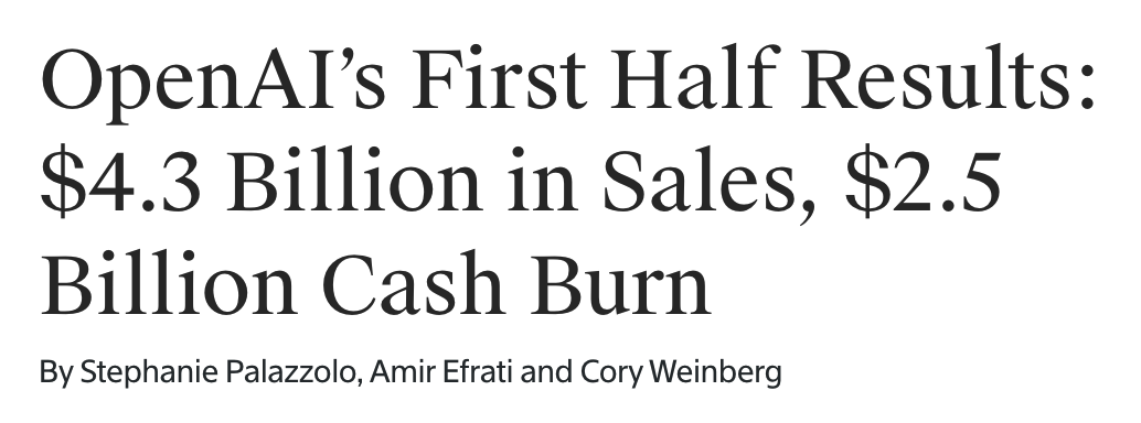 省流:OpenAI上半年营收达43亿美元,同比增长约16%;同期现金支出高达25亿美元,主要用于AI研发与ChatGPT运营。据TheInformation报道,OpenAI在2025年前六个月创造了约43亿美元的收入,超过其2024全年总收入的16%,目前月收入已突破10亿美元,全年有望达到130亿美元。但公司的支出增速更为惊人。2025上半年现金消耗达25亿美元,全年预计将达到85亿美元。经营性亏损为78亿美元,净亏损则高达135亿美元,主要源于可转股权益
