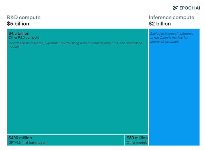 根据机构EPOCHAI最新发布的数据报告,OpenAI在2024年投入了高达70亿美元(约合人民币499.47亿元)用于向微软租用云计算算力资源。具体支出分布如下:约50亿美元被用于研发相关的计算资源,其中45亿美元主要用于后台研究以及各类实验性训练任务,只有4亿美元专门用于GPT-4.5的最终训练阶段,另有8000万美元用于其他模型的训练;约20亿美元则用于支持面向用户服务的推理计算需求。该机构基于对OpenAI从2024年第二季度至2025年第