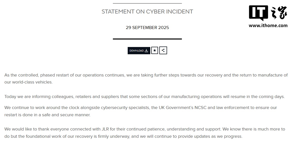 9月29日消息,捷豹路虎今日发布网络安全事件声明,向员工、经销商及供应商通报:未来数日内,部分制造业务将逐步恢复运行。声明指出,公司正与网络安全专家、英国国家网络安全中心(NCSC)以及执法机构保持全天候合作,确保重启工作以安全、可控的方式推进。捷豹路虎对所有相关方在此期间展现的耐心、理解与支持表示感谢,并强调尽管仍有大量任务需要完成,但推动业务复苏的关键准备工作已有序展开。公司将持续跟进进展,并及时发布后续信息。此前,捷豹路虎于9月2日在其官网确认遭遇网络攻击,事件“严重扰乱”了其全球生产