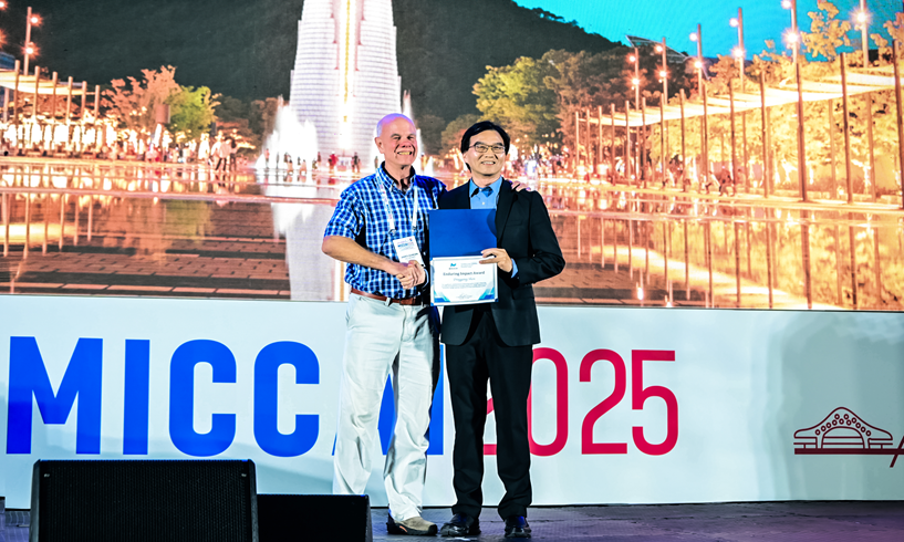 9月23日至27日,2025年国际医学影像计算与计算机辅助介入协会(MICCAI)年会在韩国隆重举行。在此期间,上海科技大学生物医学工程学院创始院长、联影智能联席CEO沈定刚荣获大会颁发的MICCAIEnduringImpactAward(EIA)持久影响力奖,成为该奖项自设立以来17年间首位获此殊荣的华人科学家。沈定刚(右一)在MICCAI现场上台领奖MICCAI协会是全球公认的医学影像计算(MedicalImageComputing)和计算机辅助介入(Comp