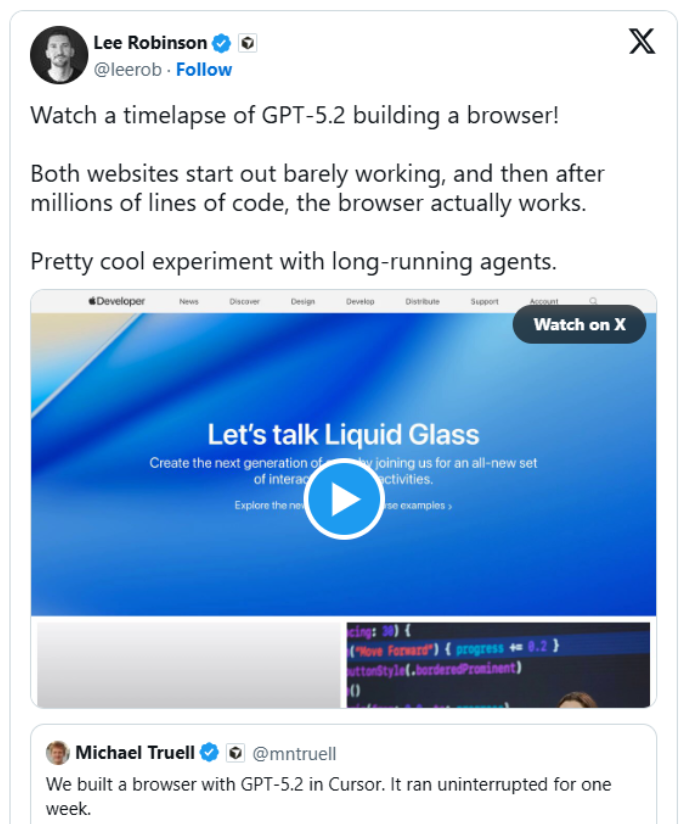 AI编程助手Cursor最近公布了一项内部评估结果:在应对超长周期、高度自主的软件开发任务时,OpenAI推出的最新版本GPT-5.2模型,在稳定性与任务一致性方面优于Anthropic的ClaudeOpus4.5。为深入检验模型的实际工程能力,Cursor研究团队发起了一项极具挑战性的实验——从零开始完整实现一个具备基础功能的Web浏览器,涵盖HTML解析器、CSS渲染引擎以及轻量级JavaScript虚拟机等核心底层模块。测试表明,GPT-5.2在涉及数百万行代