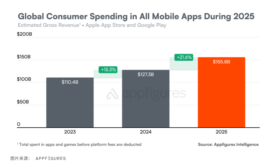 根据应用市场研究机构Appfigures发布的年度报告,尽管应用下载量已连续第五年呈现下滑态势,但订阅模式驱动的“订阅经济”仍在2025年有力支撑了移动应用整体收入的增长。预计2025年,全球用户通过AppleAppStore与GooglePlay下载的移动应用及游戏总量为1069亿次,较2024年减少2.7%;与此同时,消费者在应用内的总支出却大幅攀升21.6%,达1558亿美元。报告指出,尽管新增下载用户规模持续萎缩,开发者、营销团队及发行方仍通过优化应用内购体验与订阅转化路径,成功