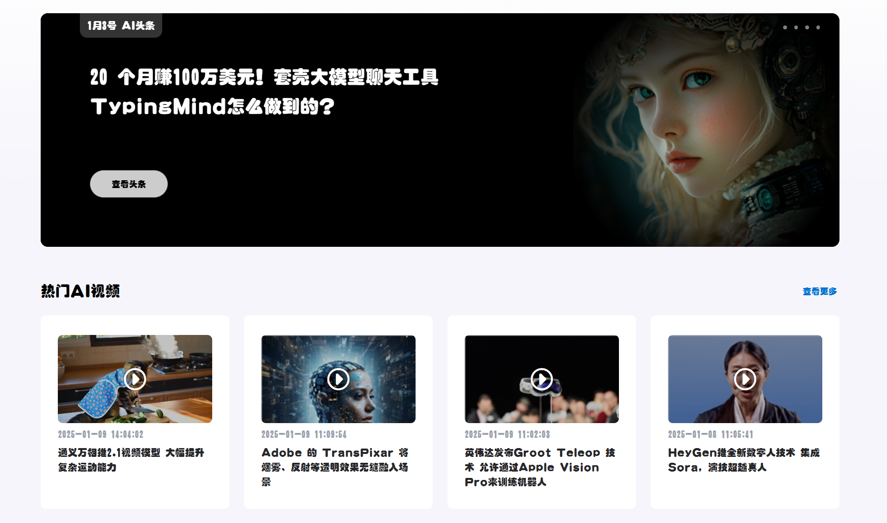 AIbase是一个专注于人工智能领域的平台,提供最新AI资讯、技术动态、产品推荐和变现指南。涵盖AI头条、热门视频、应用分类、榜单分析等,帮助用户全面了解AI发展趋势和应用机会。