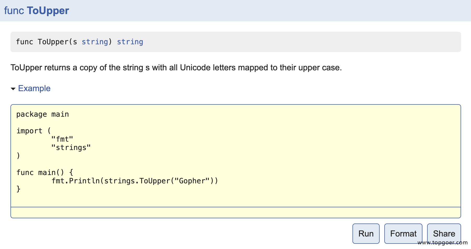 示例函数提供了可以直接运行的示例代码,可以直接在golang.org的godoc文档服务器上使用Go Playground运行示例代码。下图为strings.ToUpper函数在Playground的示例函数效果。